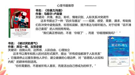 之后班会介绍了MBTI,即“迈尔斯-布里格斯性格类型指标”,鼓励同学了解自己和他人在社交时的偏好和特点,在尊重对方的前提下友好交流,沟通解决问题。同时,班会推荐了《非暴力沟通》和《被讨厌的勇气》两本心理书籍,希望能让同学了解更多人际关系交往中的心理学知识,将其更好地应用在生活实际中,学会了解自我,理解他人,尊重他人。