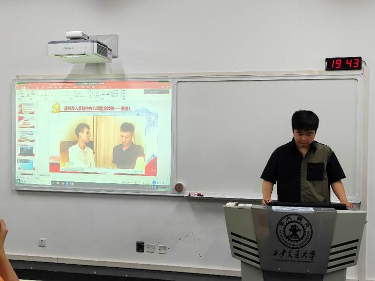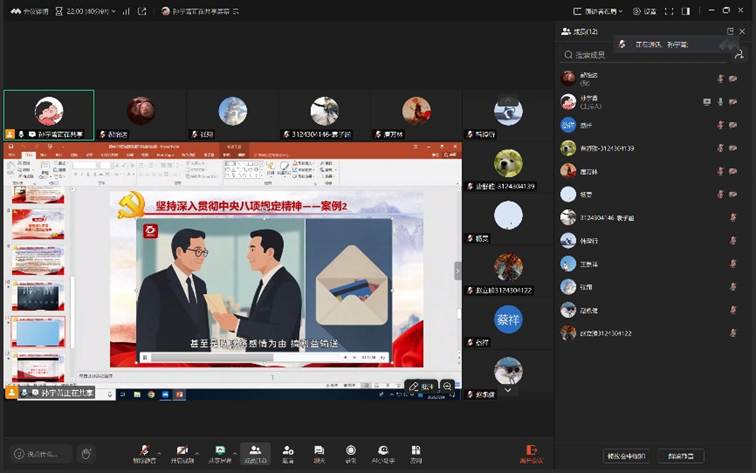 之后进入到本次活动的第二个环节——坚持深入贯彻中央八项规定精神。孙宇菁以中央纪委国家监委公开通报的典型问题为例,传达党的中央八项规定精神,以案示警、以案明纪,切实强化支部党员廉洁自律意识。随后,孙宇菁采用微党课视频的形式深入剖析中央八项规定精神的重大意义,提醒党员同志时刻绷紧纪律之弦,筑牢思想防线。