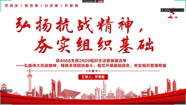 硕4068党团支部召开九月主题团日暨组织生活会。会议由团支部书记罗雅馨主持,支部全体成员参加。会议紧紧围绕“弘扬伟大抗战精神,锤炼本领团结奋斗”与“规范开展基础团务活动,夯实组织管理”两大主题,通过集体观看阅兵盛典、总结学年工作、完成换届选举、深入交流感悟四大议程,引导团员青年铭记历史、坚定信念、接续奋斗。