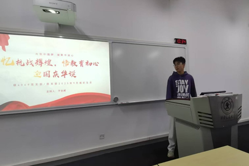 创新港校区3-6013教室举行了以“忆抗战辉煌,悟教育初心,迎国庆华诞”为主题的组织生活。会议主要围绕纪念抗战胜利80周年,引导青年群体领悟教育家精神,庆祝中华人民共和国成立76周年。会议由于京辉主持,全体党支部和团支部成员参与。