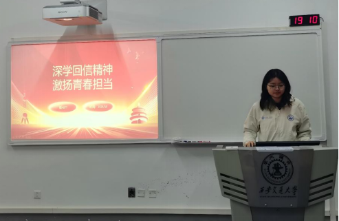 活动伊始,团支部书记刘佳潼带领全体同学深入学习了习近平新时代中国特色社会主义思想,特别是习近平总书记在回信中对广大青年的深切关怀与殷切期望。习近平总书记的回信温暖人心、催人奋进,极大激励了广大青年学子和基层团员干部。大家表示,将牢记总书记嘱托,树立远大理想、勇担时代重任,砥砺奋斗、冲锋在前,将“请党放心、强国有我”的铿锵誓言书写在推进中国式现代化新征程上,为强国复兴伟业贡献青春力量。