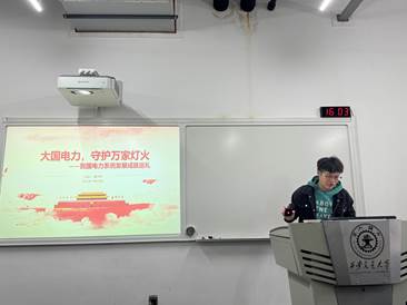 戴子程以“大国电力,守护万家灯火”为题,带领党员深入了解中国电力系统的发展历程和重大工程。从新中国初期的艰难起步到当今世界领先的特高压电网技术,从西电东送、南水北调等战略工程到新型能源体系建设,他详细介绍了我国电力事业取得的辉煌成就。戴子程强调,电力事业的发展不仅承载着国家工业化的动力,更体现了中国科技创新与制度优势的力量。支部同志应当学习这种自强不息、勇于创新的精神,在能源强国建设中贡献青春与智慧。