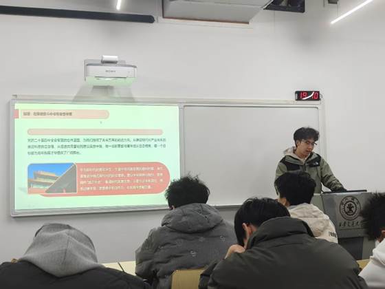 会议伊始,石浩天同志首先围绕“深学笃行二十届四中全会精神,在中国式现代化征程中勇担青春使命”开展专题学习,从“回望与立足”“定纲与定向”“攻坚与突破”三个方面系统梳理了二十届四中全会精神,重点解读了“十五五”五年规划所处的重要历史节点和关键任务,引导支部党员把全会精神内化于心、外化于行,自觉发挥青年学生在推进社会主义现代化和民族复兴伟大事业中的重要力量和坚实支撑作用。