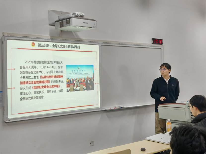 随后,第二党小组成员沈京烨同志主持“学习全球妇女峰会开幕式讲话”专题环节。他结合个人学习体会,生动阐释了讲话的深刻内涵与世界意义,引发了在场同志关于平等发展、全球治理与青年担当的深度思考和热烈交流,展现了组织成员开阔的国际视野和强烈的时代使命感。