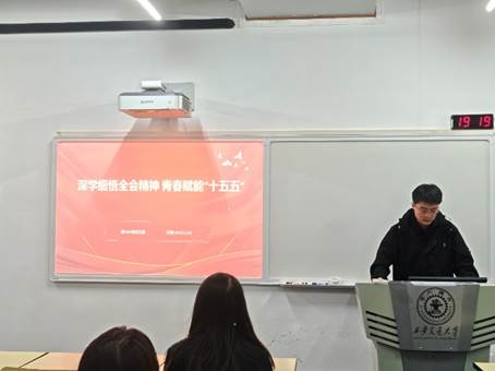 团支部书记马梓豪同志作为领学人,系统梳理了全会的基本情况与“十五五”时期的发展蓝图。他重点围绕全会审议通过的《中共中央关于制定国民经济和社会发展第十五个五年规划的建议》,解读了“十五五”时期必须遵循的六大原则和经济社会发展的主要目标,强调了“高质量发展”与“科技自立自强”在规划中的核心地位。为增进理解,会议还组织观看了央视新闻视频《一条视频看懂中国五年规划》,以生动直观的方式帮助同学们把握国家战略的连续性与前瞻性。