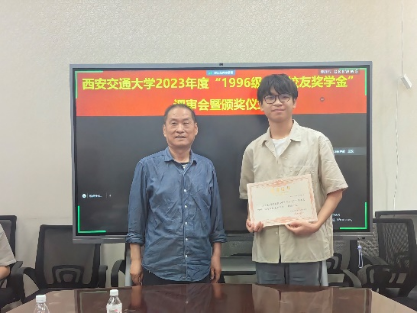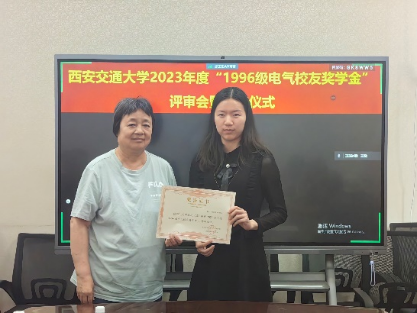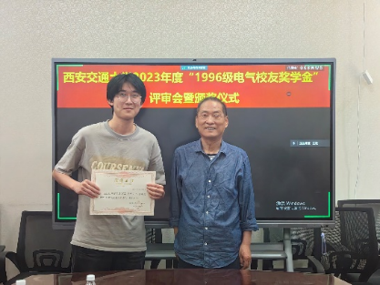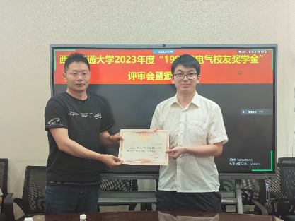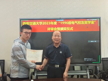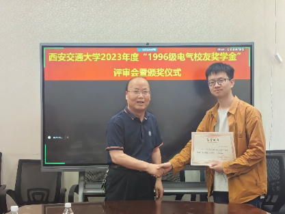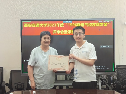 召开“1996级电气校友奖学金”评审会暨颁奖仪式,评审委员会主席张彦斌教授、委员刘崇新教授、王仲奕教授、96级电气校友粟俊(西安艾飞能源数字技术有限公司)、96级电气校友曹卫国(南京五采智电电力科技有限公司)、96级电气校友左广巍(武汉致卓测控科技有限公司),96级电气校友邹加勇(中兴通讯西安研究所),“1996级电气校友奖学金”管理委员会副主任陈玉老师出席会议。评审委员会根据申请人学习情况,创新能力,综合素质,社会实践表现综合评定,最终评选出电测、发电、电机、绝缘、电器、三电、工企、高压方向各1名,共计8名三年级本科生,授予2023年度“1996级电气校友奖学金”。