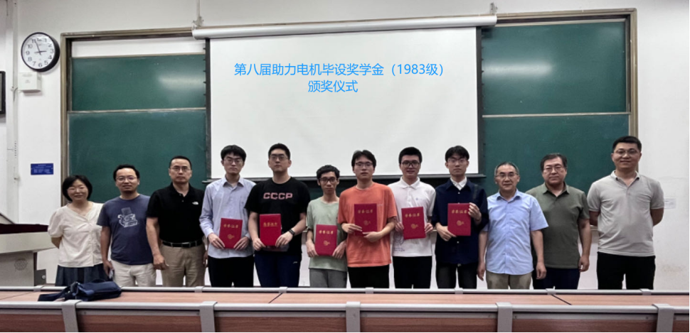 电机教研室在东1东330举行了简朴而隆重的第八届“助力电机”毕业设计奖学金颁奖仪式,该奖学金由电机专业83级校友集体捐资创立,每年评选一次,用于奖励毕设期间表现优秀的同学。