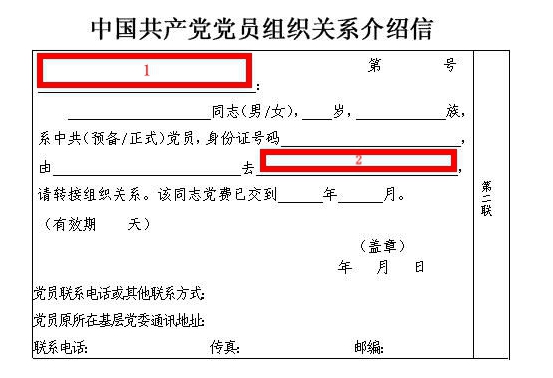 1. 与转入单位确认党组织关系介绍信的抬头和去向,即下图中红框1和2的信息,注意红框2的内容不允许填写“你处”;